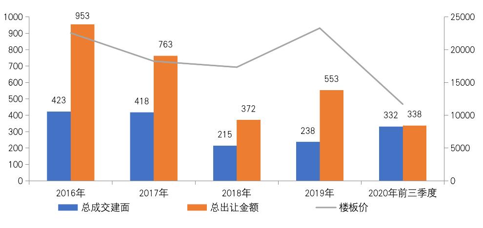 图:2016-2020年前三季度深圳经营性土地总成交建面、成交金额和楼板价(万平方米、亿元、元/平方米)
