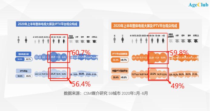 据CSM媒介研究2020年上半年数据,整体电视大屏及IPTV平台观众构成中,45岁+的用户,整体电视大屏有60.7%,IPTV平台有56.4%,IPTV平台直播频道有59.8%,中国IPTV互动平台有49%。