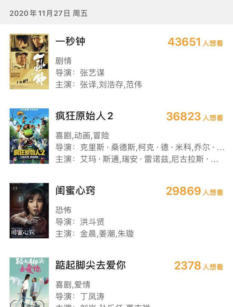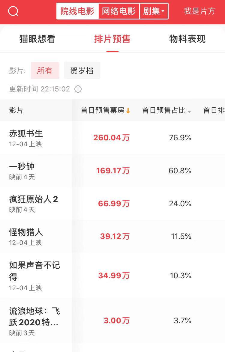 而已开启电影预售的电影中,《赤狐书生》《一秒钟》占据前两位,但是预售票房均在百万级别,随后《疯狂原始人2》《怪物猎人》两部进口片预售仅几十万级别。
