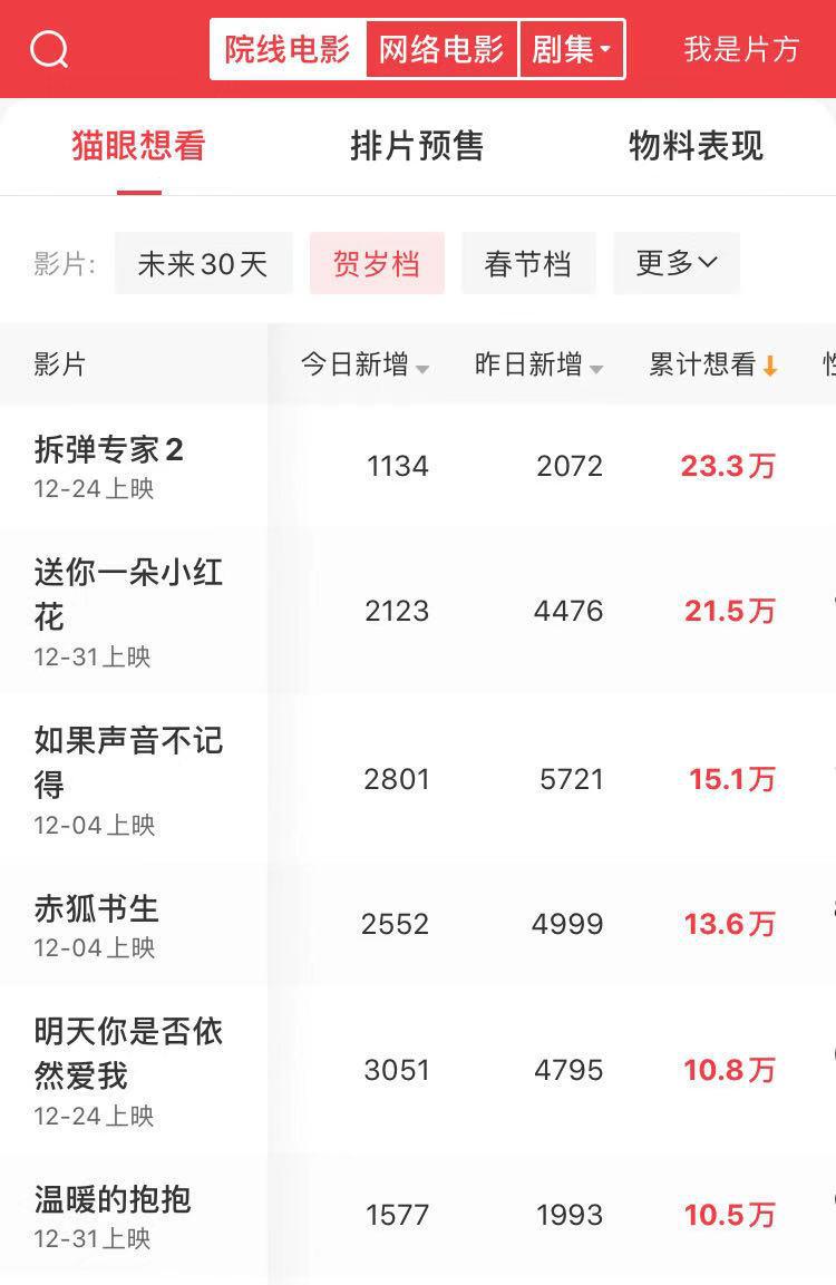 目前来看国产头部电影拥有更大的热度优势。根据猫眼想看指数,贺岁档中《拆弹专家2》以累计23.3万想看人数成为档期想看热度最高的电影,其次是易烊千玺主演的《送你一朵小红花》,而《疯狂的原始人2》《神奇女侠2》想看人数目前仅两三万左右。
