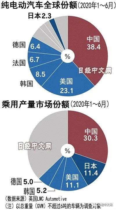 英国LMC Automotive统计显示,在2020年1~6月的全球纯电动汽车产量(66万辆)中,中国占到约4成的25万辆,高于美国(23%)和日本(2%)。1~6月中国的汽车出口减少,但以纯电动汽车为中心的新能源汽车增至上年同期的2.4倍,达到3万6900辆。出口额增至3.7倍的11亿美元。
