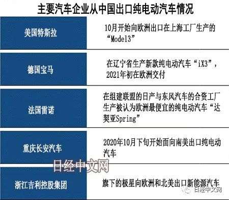 中国正在成为纯电动汽车(EV)的全球出口基地。美国特斯拉和德国宝马在2021年初之前将从中国向欧洲出口纯电动汽车。中国企业的出口也在增加。中国借助普及纯电动汽车的新能源车(NEV)新规,汇聚了电池等相关的零部件企业。作为在销售和生产方面主导世界的“纯电动汽车强国”正在提升存在感。