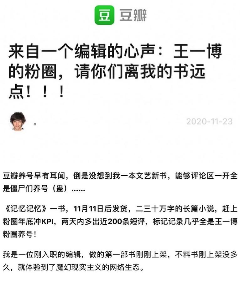 《心声》是文艺小说《记忆记忆》的编辑所写,控诉了艺人王一博的粉丝在豆瓣养号,而位于豆瓣手机页面新书推荐首位的《记忆记忆》则成为了被粉丝刷屏的“重灾区”,在两天内多出近200条无关的短评。