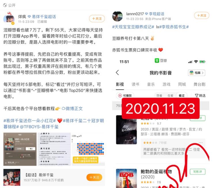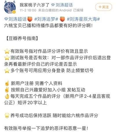 但是随着豆瓣评分越来越受到粉丝的重视,在豆瓣养号的现象也愈来愈严重。豆瓣的评分机制中,账号权重也会影响其打分所占比重,而不够活跃的账号打分则会被判定为无效。因此,在自己偶像的作品播出前“养”出一个活跃的账号以备播出后能打五星,就成为了粉丝们表达支持的方式。
