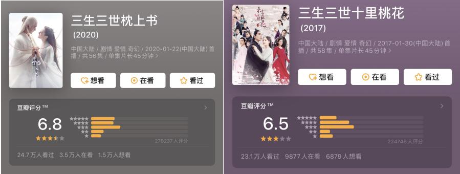 具体来看,以《三生三世十里桃花》与《三生三世枕上书》为例,2017年播出的前者豆瓣评分6.5,2020年播出的后者则为6.8。从分数构成来看,二者的“看过”人数相差不大,但《枕上书》的五星比例明显更高,而《桃花》则是以三星、四星为主。