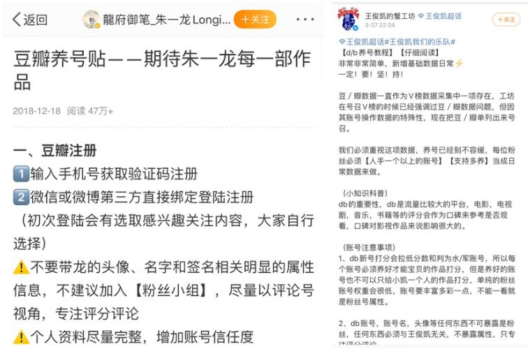 河豚君粗略搜索了一下发现,2018年就有朱一龙粉丝发布的“豆瓣养号贴”,王俊凯后援会“王俊凯的蟹工坊”几乎每天都会发布豆瓣养号教程。