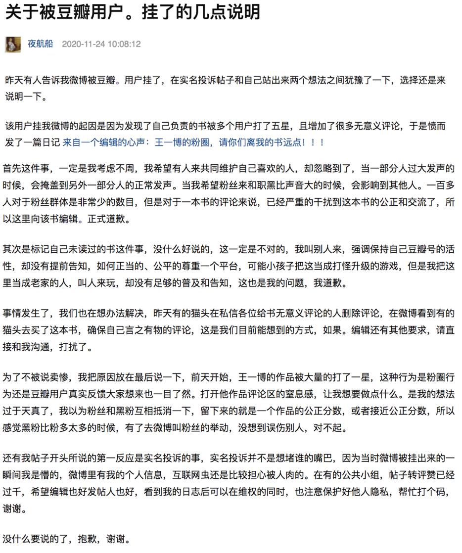 豆瓣方也告诉河豚君,《心声》一文中被“挂”的王一博粉丝已经在豆瓣平台公开道歉。
