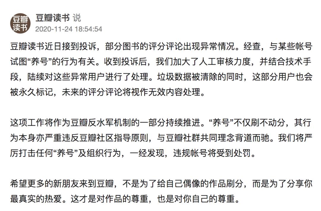 豆瓣读书今日晚间发布公告,称平台将加大人工审核力度,持续推进“反水军机制”。