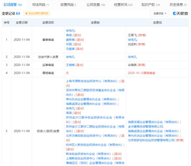 11月4日,青松、洪泰、巨人等多家机构退出公司投资人行列,以盛希泰为首的四名董事也相继退出,由新浪微博CEO王高飞、新浪微博投资业务负责人刘运利接替。同日,股东名单中新增微博关联公司——北京微梦创科创业投资管理有限公司。