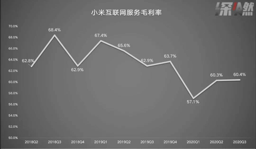财报显示,小米的整体毛利率由2019年第三季度的15.3%降至2020年第三季度的14.1%,IoT和互联网的毛利率一增一降,分别由12.8%涨到14.2%,由62.9%降至60.4%。对于后者,小米解释,是金融科技及游戏业务毛利率下降所致。