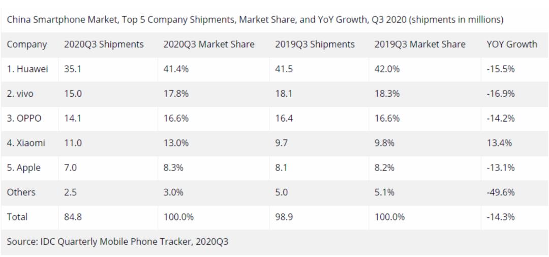 财报中并未提及具体出货量。对此,IDC数据显示,华为三季度以3510万台稳居第一,市场份额41.4%,位列第四的小米出货量1100万台,市场份额13%,是TOP5厂商中唯一增长的品牌,同比增长13.4%。照此计算,小米手机国内出货量的贡献度只有23.6%。
