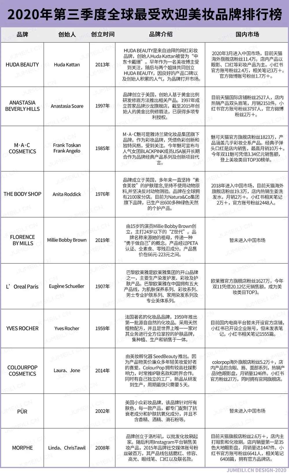 今年7月聚美丽也针对该榜单第一季度报告,进行相关分析。详情点击《全球最受欢迎TOP10美妆品牌榜单揭晓,前浪后浪各占一半》,由榜单可见前三位Huda Beauty、Anastasia Beverly Hills和MAC(魅可)依然没有改变,而在前10排名中也出现了The Body Shop(美体小铺)、L’Oreal Paris(巴黎欧莱雅)、PÜR这样的新面孔。