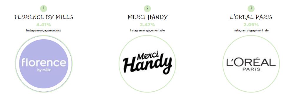在粉丝参与度排名中发现,Florence by Mills依然排名第一,虽然随着时间的流逝,品牌初期时的炒作热度下降,但该品牌依然以4.41%的参与度排在第一。不过对于一个Instagram粉丝200万的品牌来说,这样的参与度还是令人印象深刻的。