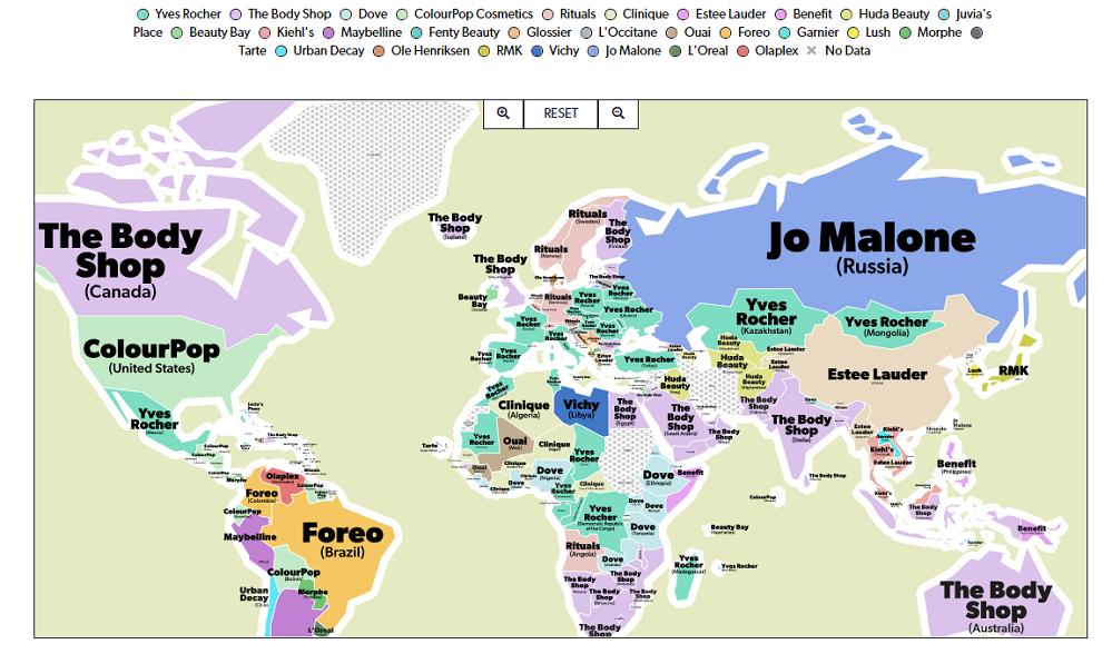 除了从主流的社媒平台上来分析之外,Cosmetify还根据美妆品牌全球搜索量,来判断美妆品牌在全球范围内受关注的程度。我们从下面这张世界地图来发现“新大陆”。