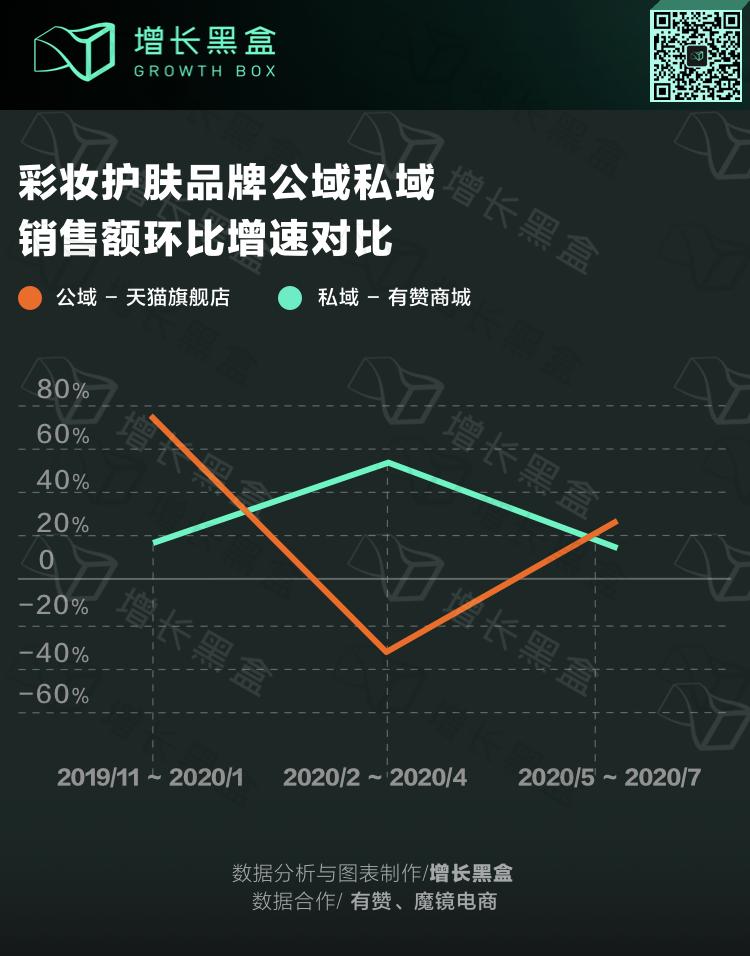 我们对比了近30家目标品牌在过去一段时间的环比增长,可以发现,在2019年末,受双十一影响,公域的增长率远高于私域。而到了今年年初疫情到来之际,因双十一效应过去,公域的销售额环比呈负增长,而随着品牌对私域的重视,私域销售额增长迅速。