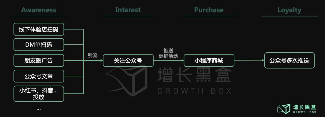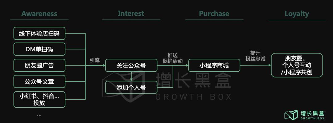 公众号版链路是三种私域链路中最基础、最简洁的一种。这一私域运营链路主要围绕公众号展开用户培育,上承多种渠道获客,下接小程序商城转化。