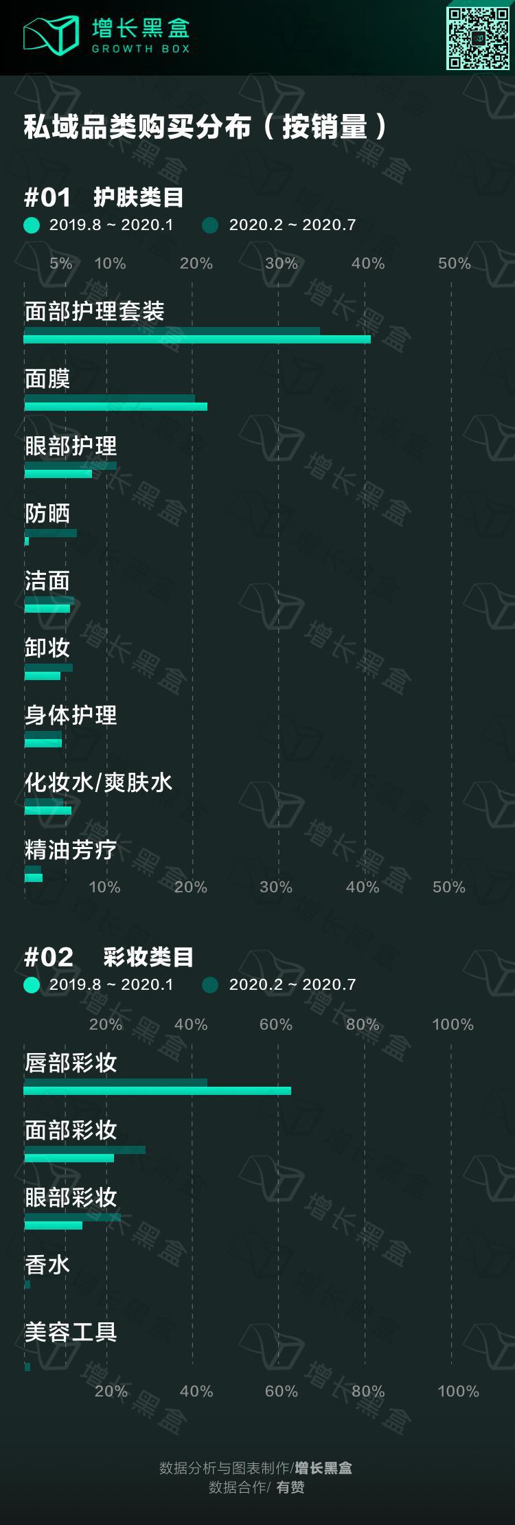 而从品类来看,“面部护理套装”和“面膜”是私域内销量最好的两大护肤类目,而“唇部彩妆”、“面部彩妆”、“眼部彩妆”依次是私域内销量最高的彩妆类目。另外,不难看出,疫情对于消费者品类选择的影响。疫情(2020.2月~7月)时间段内,眼部护理、眼部彩妆、面部彩妆比例相较疫情之前都有所上升,而唇部彩妆比例则有所下降。