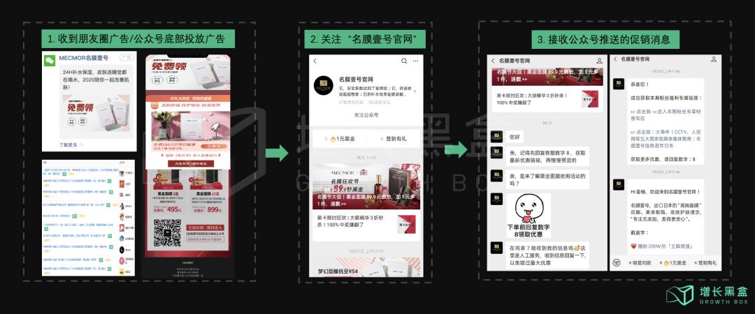 名膜壹号采用了典型的公众号型私域链路。用户收到品牌在朋友圈或公众号文章中投放的广告后,会跳转关注其公众号“名膜壹号官网”,之后将不断接受公众号推送的各种促销信息。
