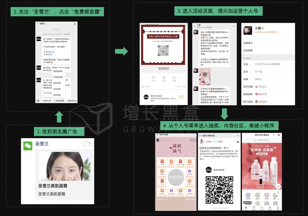 圣雪兰的私域链路是典型的公众号与个人号结合的例子。用户在朋友圈看到圣雪兰投放的广告后,会跳转关注公众号。用户点击菜单中的“免费领面霜”,会提示添加运营的微信个人号。用户添加好友后,可以通过运营的个人企业微信号菜单进入抽奖、内容社区、商城小程序等。运营也可以定期通过私聊向用户发送促销信息,在内容社区、朋友圈与用户互动。