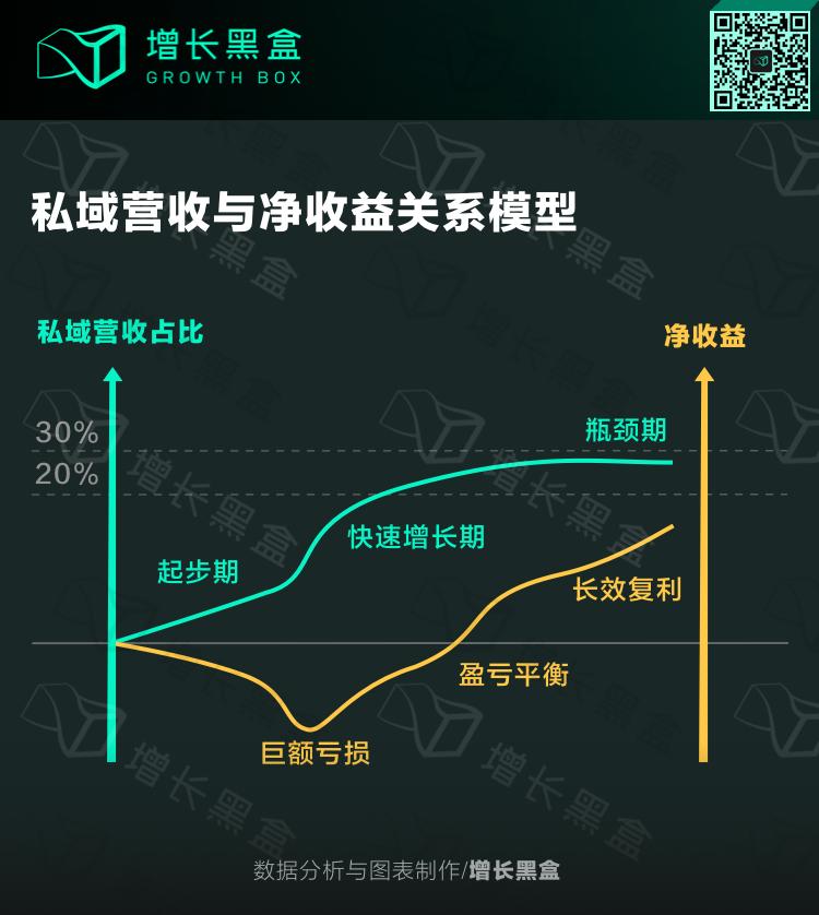 而伴随私域规模进入瓶颈期,模式逐渐稳定,边际成本降低,客户复购率、LTV也在提高。因此,净收益逐步提高,走向盈亏平衡并创造出长效的复利。