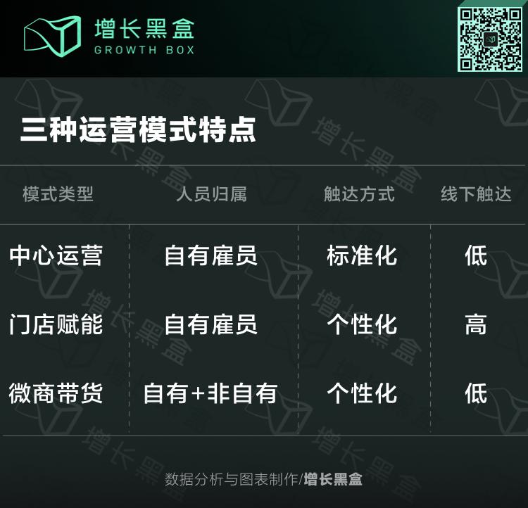 调查了65家美妆品牌的私域生态后,我们从中总结出了三种典型的私域运营模式。根据人员归属、触达方式、线下占比这三个属性,我们将美妆品牌的私域分为中心运营、门店赋能、微商带货三种模式。