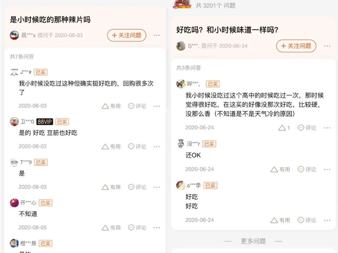 在卫龙、麻辣王子等品牌的辣条产品评论区,许多消费者开始询问,“味道和小时候吃的一样吗?”,也不乏“和以前那种辣条还是不一样了”、“感觉少了小学门口那种味道”一类的怅然评论。