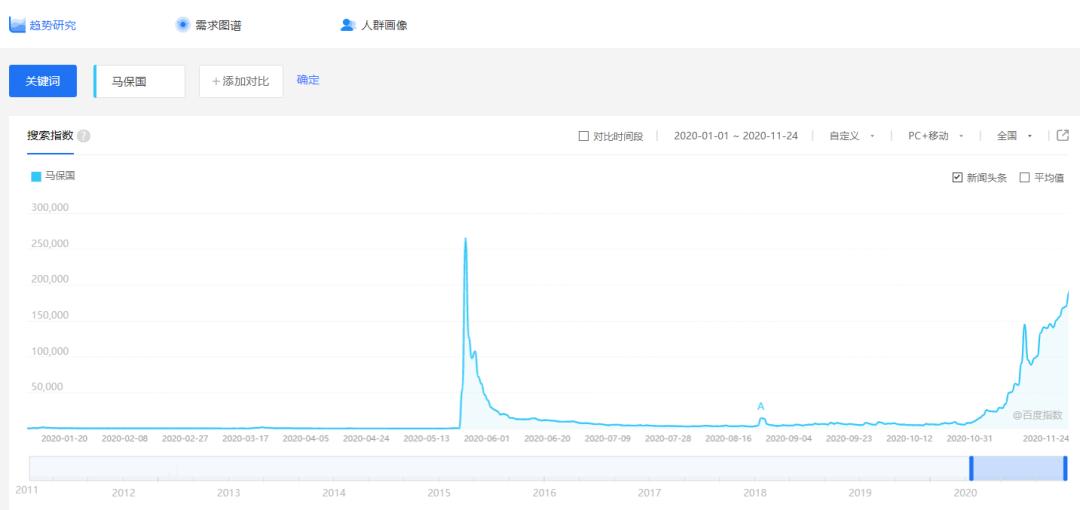 根据百度指数显示的“马保国”的相关指数,热度自5月16日开始飙升,在5月18日达到顶峰,甚至超过最近的热度。