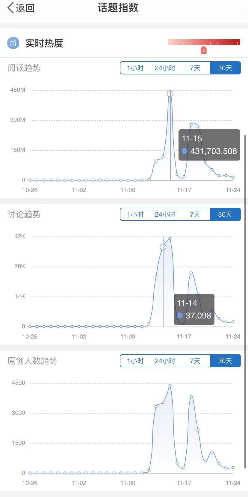 截至11月24日,微博话题#丁真#的阅读量已经突破14.4亿,而无论是阅读趋势、讨论趋势、原创人数趋势都从11月12日的0开始,在11月14日和15日达到了高潮,11月18日是第二个小高峰,微博成为了丁真走红的二次爆发点。