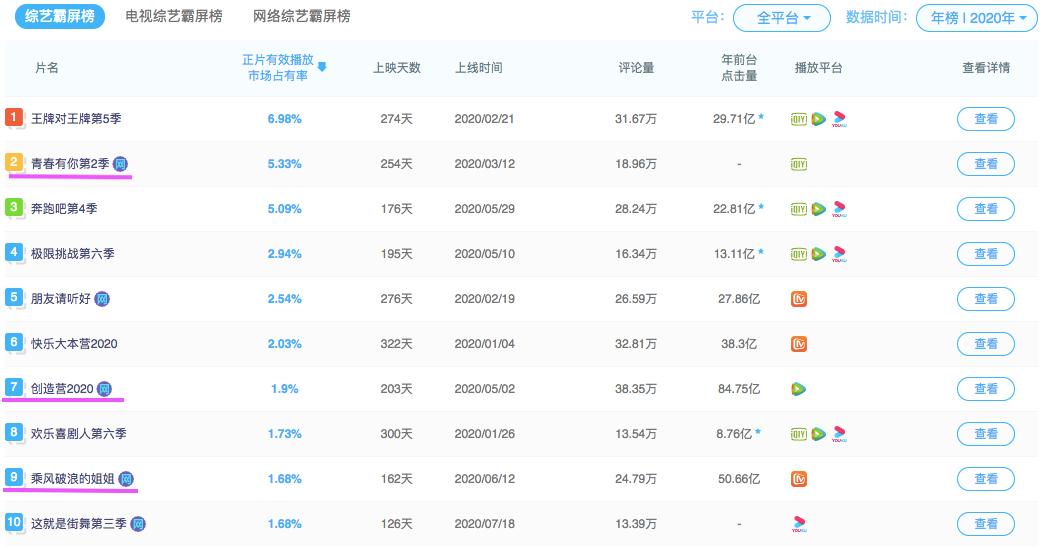 注:2020年度综艺“有效播放霸屏榜TOP10”;榜单数据来源:云合数据