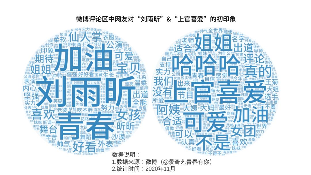 然而值得反思的是,我们在对@爱奇艺青春有你官博发布的#青春有你2初印象TMI#话题下的评论区进行分析时发现,选手刘雨昕以极具中性风的形象进行第一次视频自我介绍后,获得了大部分网友的认可,大家对她的评价词有:仙人掌女孩、帅气、坚强、努力、全能、好看等等。而另一位选手上官喜爱的第一次视频介绍赢得认可的同时,也引来了极多的争议,其中阿姨、大姐、大姨、大妈等词语频繁出现在评论区,更有人直言“哈哈哈哈,认真的吗?”