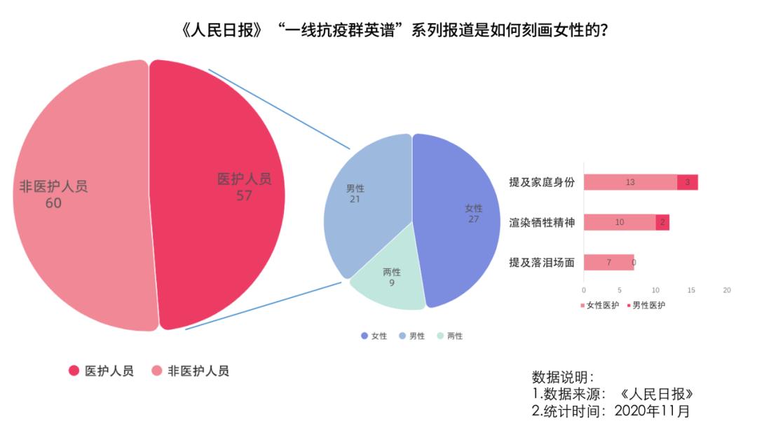 本文选取《人民日报》以抗疫人物为报道主题的“一线抗疫群英谱”系列的117篇报道为样本进行分析。其中,关于医护人员的主题报道共57篇,以男性为报道对象的有21篇,以女性为报道对象的有27篇,两性均涉及的有9篇。