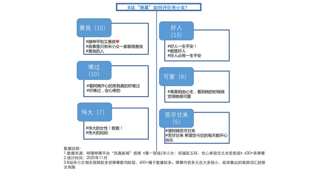我们在对凤凰网发布在B站的视频《第一现场|宋小女:祝福张玉环,也心疼现任丈夫受委屈》的630条弹幕进行采集、梳理后制作了下图: