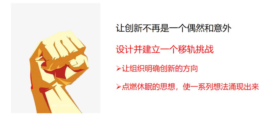 移轨挑战是组织实现突破性创新的基石和原点,通过设计一个具体的跳出盒子的挑战,从而引起一种正向的不安,促使企业离开舒适区,坚定地去实现移轨创新。