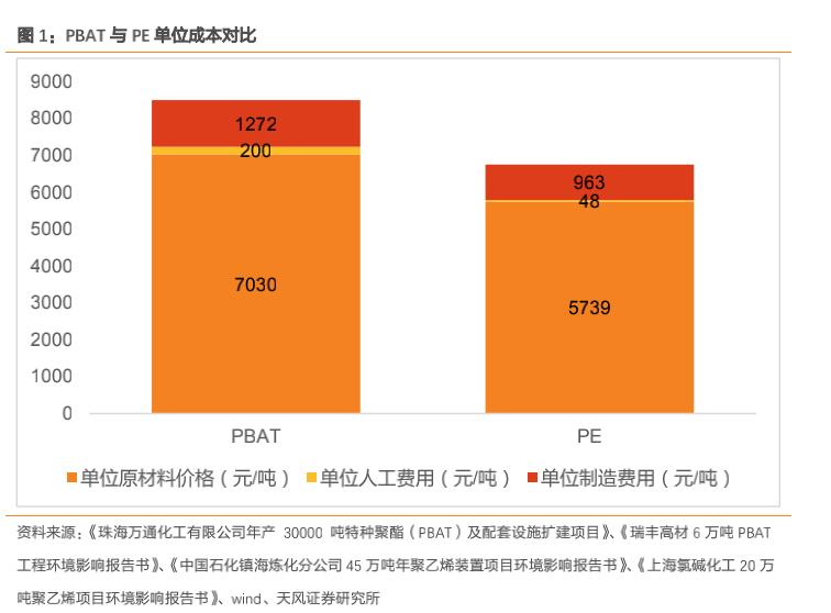 当投资设备满产时,PBAT的单位原材料成本、人工成本和制造成本共 8502 元/吨。与PE相比,单位成本高出 26%。
