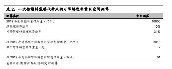 其次,是一次性塑料袋。2019年全国塑料袋使用量为10950亿个,可降解塑料袋存在3055亿个的替代空间,约合61万吨。