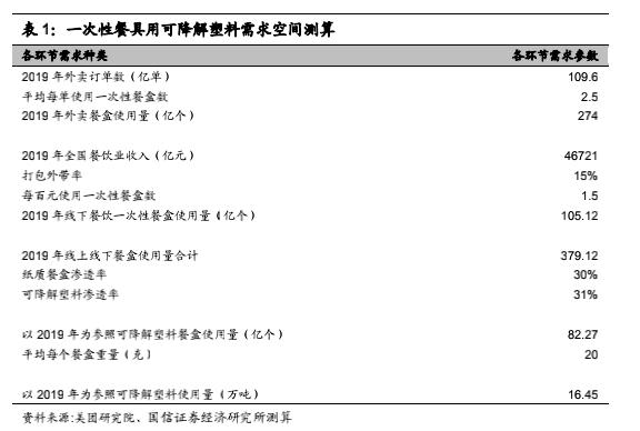 测算得出,2019年总外卖餐盒的使用量为274亿个,线下餐饮一次性饭盒使用量为105.12亿个。按照31%的渗透率计算,可降解餐盒存在82.27亿个的替代空间,相当于使用可降解塑料16.45万吨。