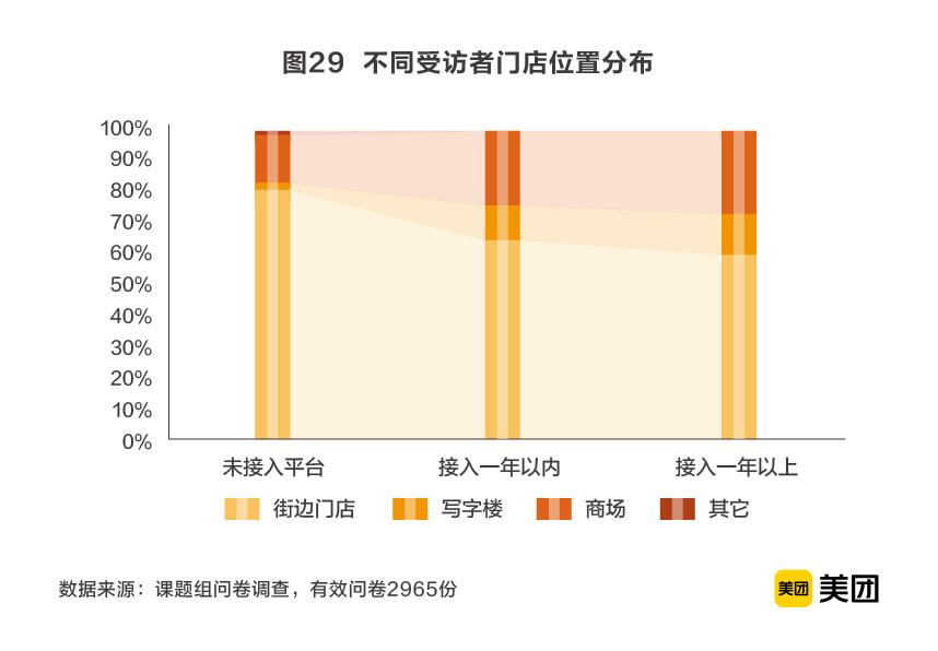 而在经营管理和推广引流方面,接入与否的差异也较为明显。调查结果显示,接入平台的商户在店铺面积、员工人数、经营规模等方面均占有一定优势。接入平台的商户中有64.0%的商户为连锁经营,有27.8%的商户的连锁店铺数量多于5家,有0.6%的商户拥有50家以上的连锁店铺;而未接入平台的商户中有75.6%的商户为单店经营。