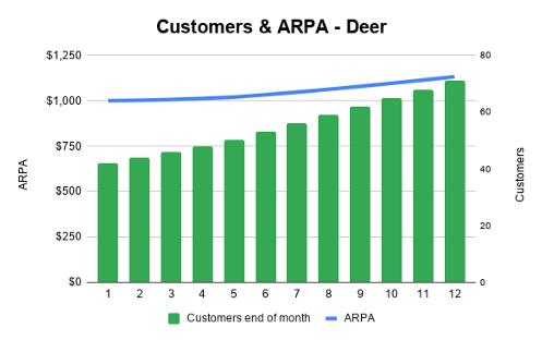 B公司的“兔子客户”数量几乎翻了两番,而这部分的ARPA却从50美元下降到40美元。B公司的“鹿客户”数量从40个增加到71个,同时ARPA从1000美元增加到约1130美元。
