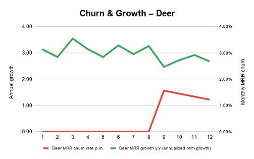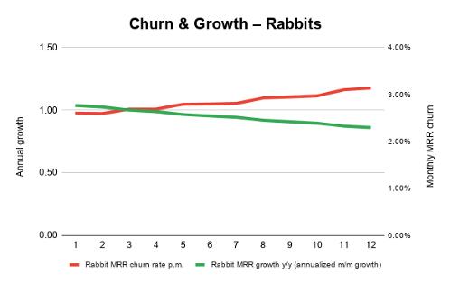 但如果我们把这些数据细分成“兔子客户”和“鹿客户”,我们注意到“兔子客户”代表的业务正在恶化,表现为更高且上升的流失率和增长的放缓,这在总图中并不会被显示。“鹿客户”代表的业务在这张图上也不好看,但它的流失率明显较低(1-1.5%)。