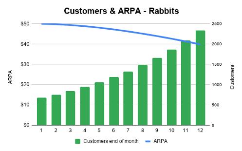 我们再看另一家虚构的SaaS公司,B公司。从这张图中可以看出,在过去12个月里,B公司的客户数增加了三倍多,但它的ARPA(每客户平均收入)却从100多美元暴跌至不到70美元。