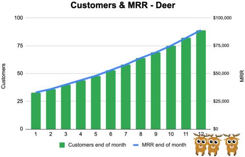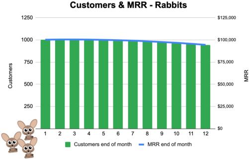 你不能在这张图表中看到的是,A公司是服务于两种不同的客户,分别是“兔子客户”(年合同额1000美元,这里指代小客户)和“鹿客户”(年合同额10000美元,这里指代更大型的优质客户)。上表统计的客户数和MRR数据是这两个细分市场客户的数据的汇总。我们来看看这两个部分的具体情况:
