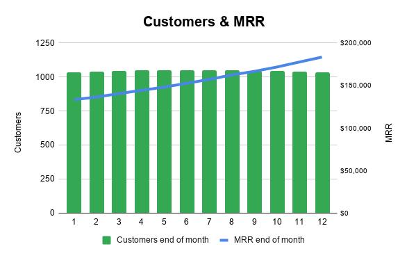 你看到的是一家表现不佳的SaaS公司关于客户数和MRR的年度报表。这是一家我们虚构的SaaS公司,A公司,它的客户数量并没有增加,虽然MRR(每月经常性收入)有所增长,但40%的年增长率并不令人兴奋,并且这40%的MRR增长基本来自于ARPA(每客户平均收入)的明显增长。