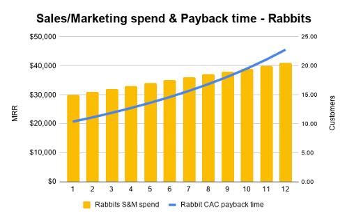 按细分市场的销售和营销KPI进行拆解,可以发现CAC的回报时间在“兔子客户”代表的业务增加了一倍多,而“鹿客户”的回报时间却在不断减少。如果你是CEO,却没有掌握这些信息,就会一直在“兔子客户”身上浪费钱,而这些资源本可以用来开发更多优质的“鹿客户”。