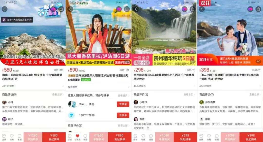 在“百亿补贴”下,拼多多旅游价格极具诱惑力。如三亚5天4晚游拼单价580元,昆明大理丽江6日游拼单价890元,贵州5天4晚游拼单价298元,福建厦门5天4晚赶海游拼单价398元,这个价格可以说直接把几大热门旅游地的旅游套餐价直拉至“冰点”。