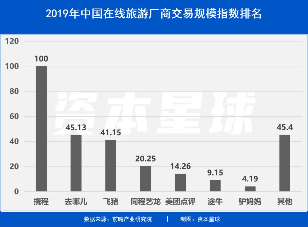 以交易规模计算,2019年携程系在中国在线旅游厂商中遥遥领先,阿里系和美团点评也占领头部位置。从在线OTA市场份额来看,途牛、携程、驴妈妈、美团点评四家共同占据74.9%的市场份额。