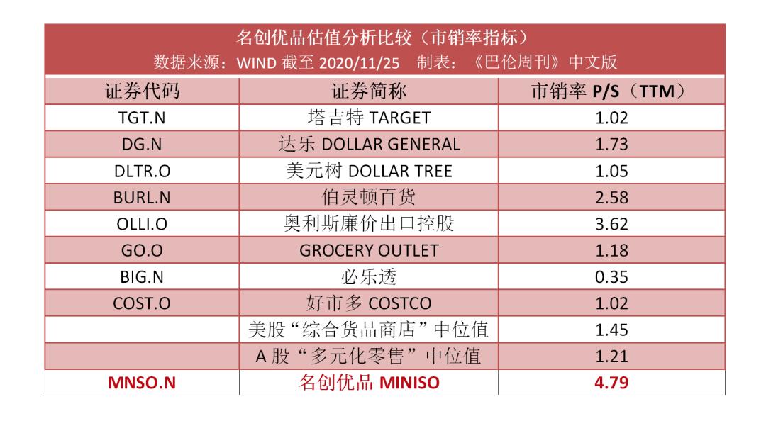 《巴伦周刊》中文版认为,即使考虑基于作为全球化品牌及其未来成长性的溢价,名创优品目前4.79倍的市销率依然偏高。从希望获得足够股价增值的投资者角度出发,两倍于同业中位值1.45,即市销率大约为3,也许是更合理的。