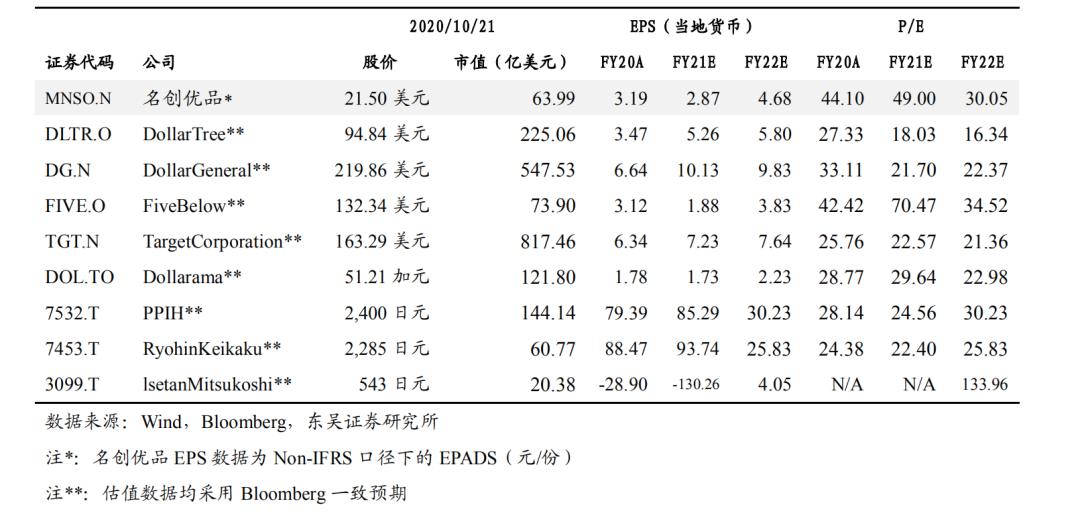 可以看到,采用上述较为乐观的预计数据,与其他可比公司的彭博一致预期相对照,名创优品未来两年的估值水平仍将明显高于同业。