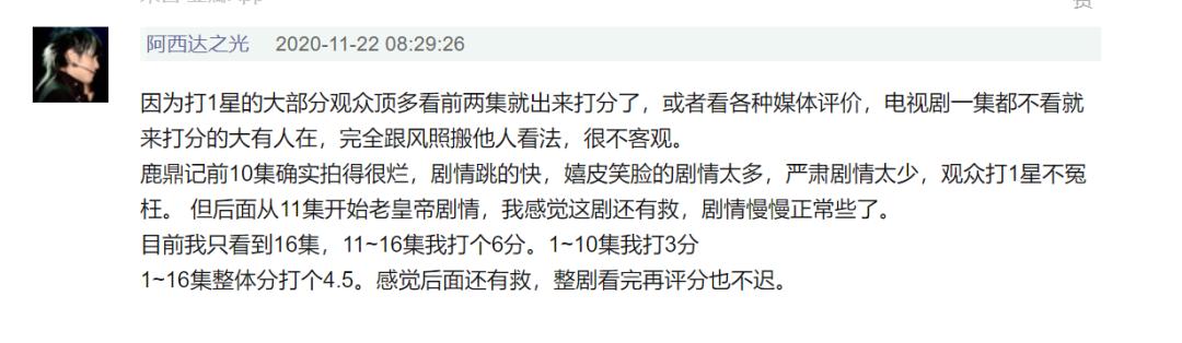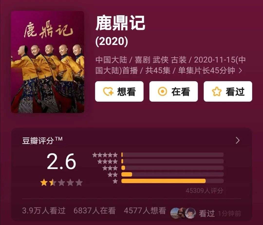 这次张一山版《鹿鼎记》仅半天定档上线的快节奏,首播最先吸引的一部分受众是奔着金庸小说而来的“金粉”,首轮观看后的评价自然也大多围绕内容展开,被评为“翻拍最失败的金庸剧”、“一场闹剧,一个笑话”,毫不掩饰的给出了一星。内容改编过大,故事发展的逻辑缺失,失去金庸笔下韦小宝的特性、失去主题价值、演员演技浮夸为主,也成为差评的主要议论点。