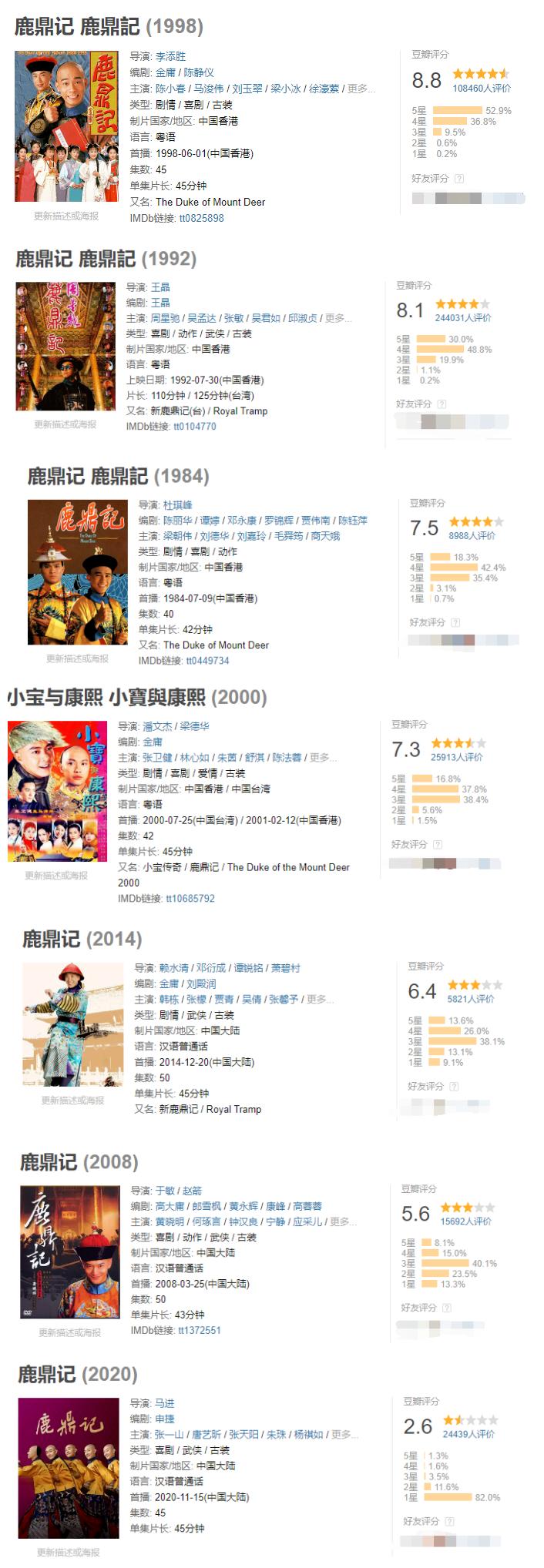 要知道金庸的“武侠宇宙”曾经是众多80后90后的青春,从80年代开始他的小说几乎每隔几年就要被翻拍一次,有网友统计已被改编出158部影视,《鹿鼎记》也相继被影视化改编出不下8个版本。