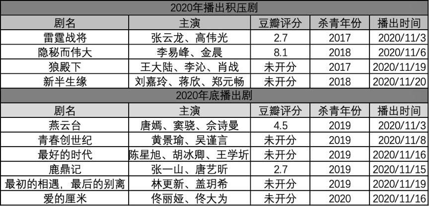 纵观11月开播剧,其中演员咖位不小、制作体量不小的剧集,大概有十部。积压剧就占了四部,近一半。